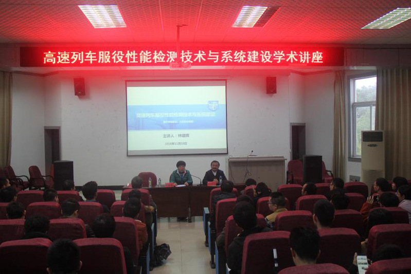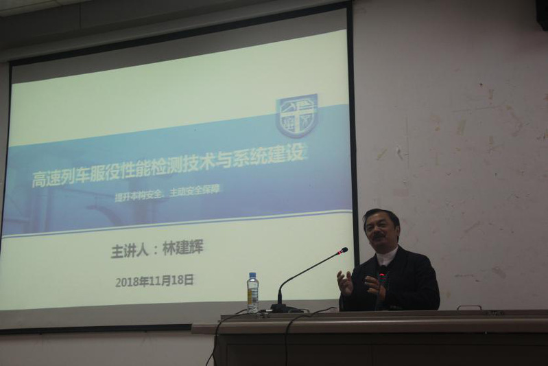 2018年11月18日,西南交通大学牵引动力国家重点实验室教授、青岛研究院经理林建辉教授应邀为公司师生作高速列车服役性能检测技术与系统建设的学术讲座。经理刘燕德致欢迎词,党委书记周尔民,副经理肖乾、各系部老师、全体研究生参加了此次讲座。