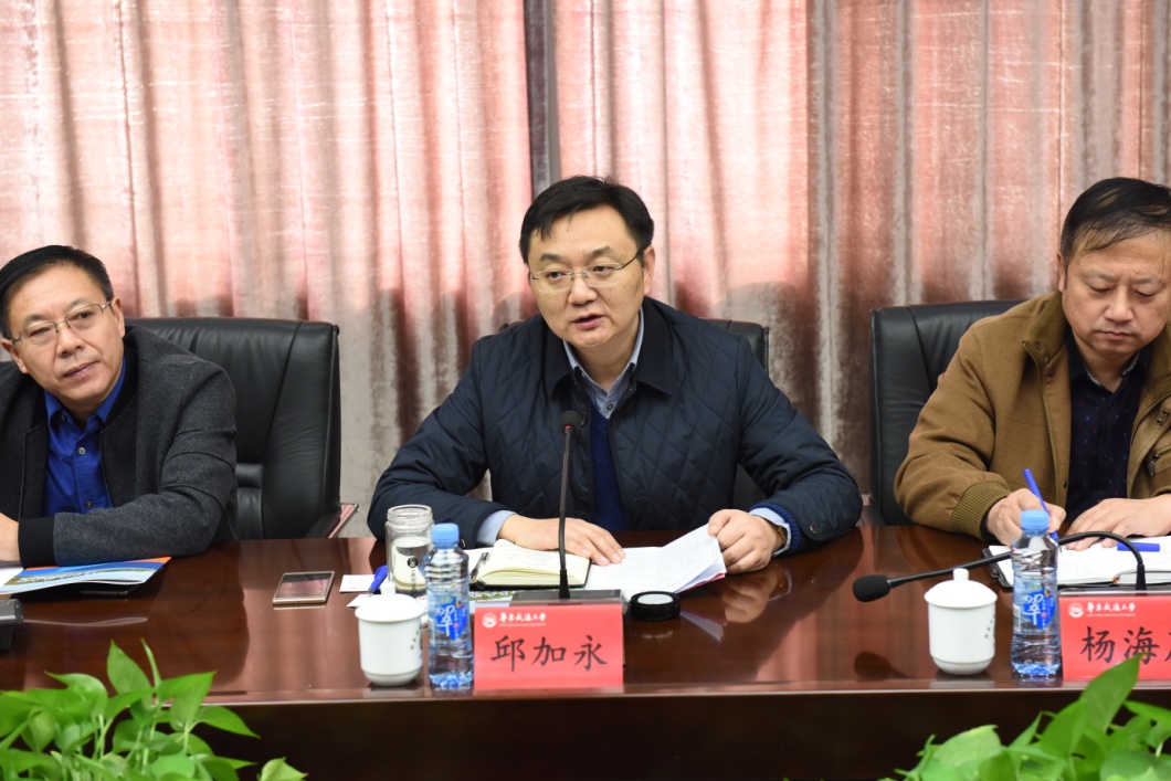 邱加永从机械制造、新能源、汽车零部件和医疗健康产业方面对高邮市的产业情况作了详细的介绍,并阐述了此次华东交大之行的目的:一是推荐高邮,提高高邮市在高校中的知名度,让高校认识高邮,了解高邮,走进高邮,深入推进合作交流。二是答谢,他代表高邮市政府对华东交大多年来为高邮10多家企业提供人才和科技支持表示感谢,希望市校之间进一步加强交流与合作。三是求贤,希望公司能够推荐更多的优秀科技人才到高邮市挂职锻炼,为当地企业的发展解决技术等方面的难题,继续为高邮的发展提供智力支持。
