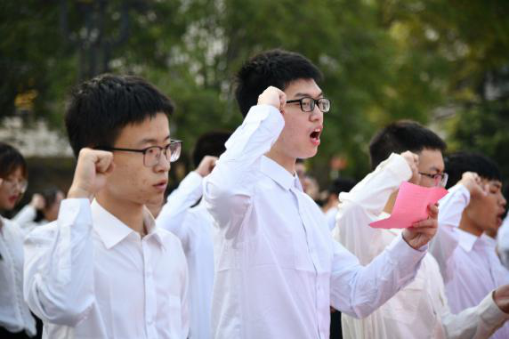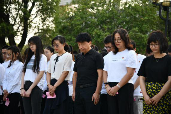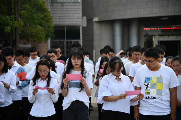 7点30分,全体人员庄严肃立,为九一八先烈默哀三分钟,深切缅怀战争中的遇难同胞。牢记历史,勿忘国殇,吾辈自强!礼毕,全体人员举起右拳庄严宣誓:不忘“九一八”血雨腥风,弘扬先烈爱国之情,缅怀英烈报国之志,恪守革命精神之愿,日新其德止于至善,以青春的名义,做时代的先锋。