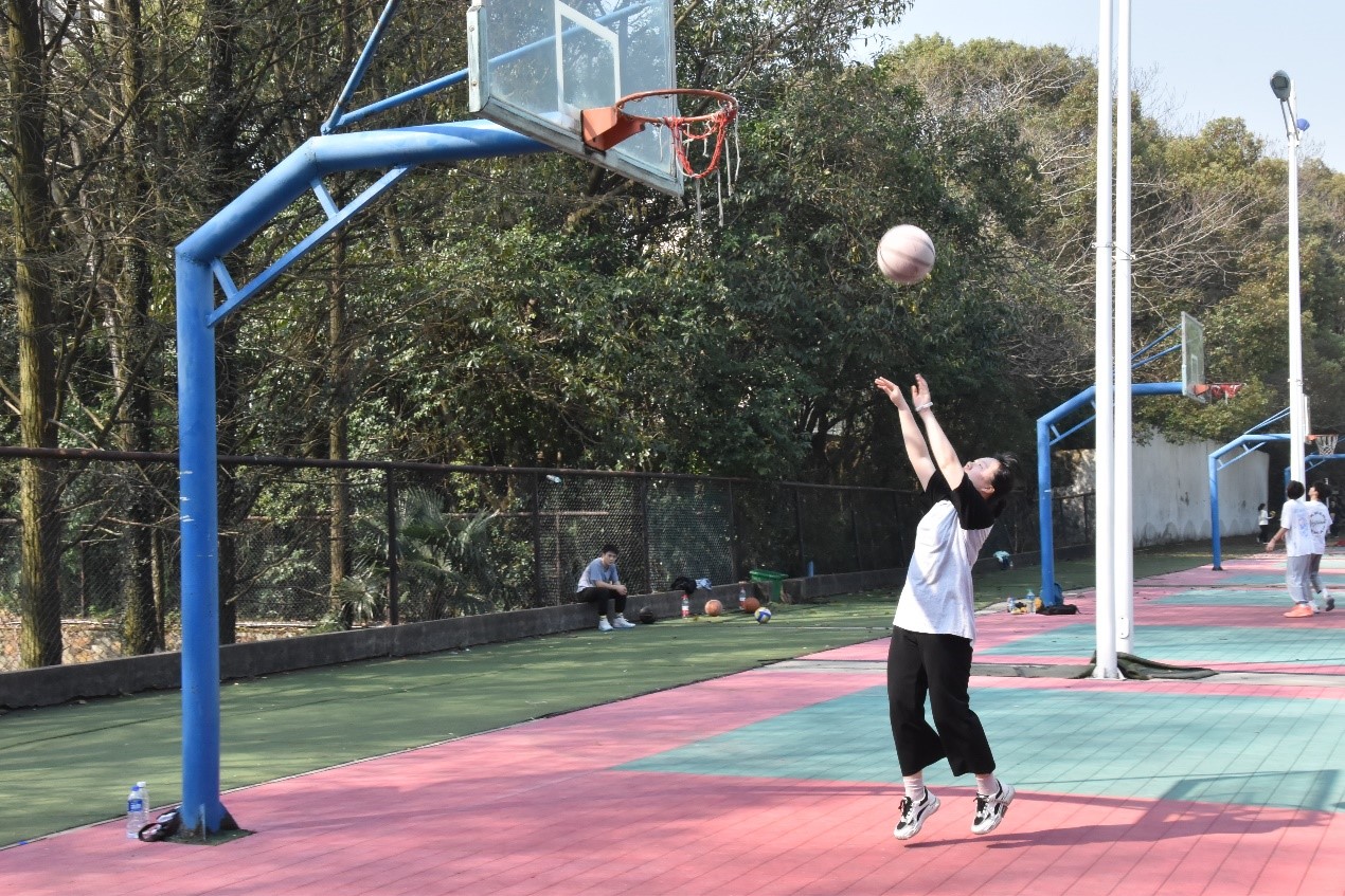 逐渐找回手感后,队员们依次投篮。她们脚步稳健、身形敏捷,运球后两个箭步,奋力腾空一跃,篮球在空中划过优美弧线,最终成功入筐。