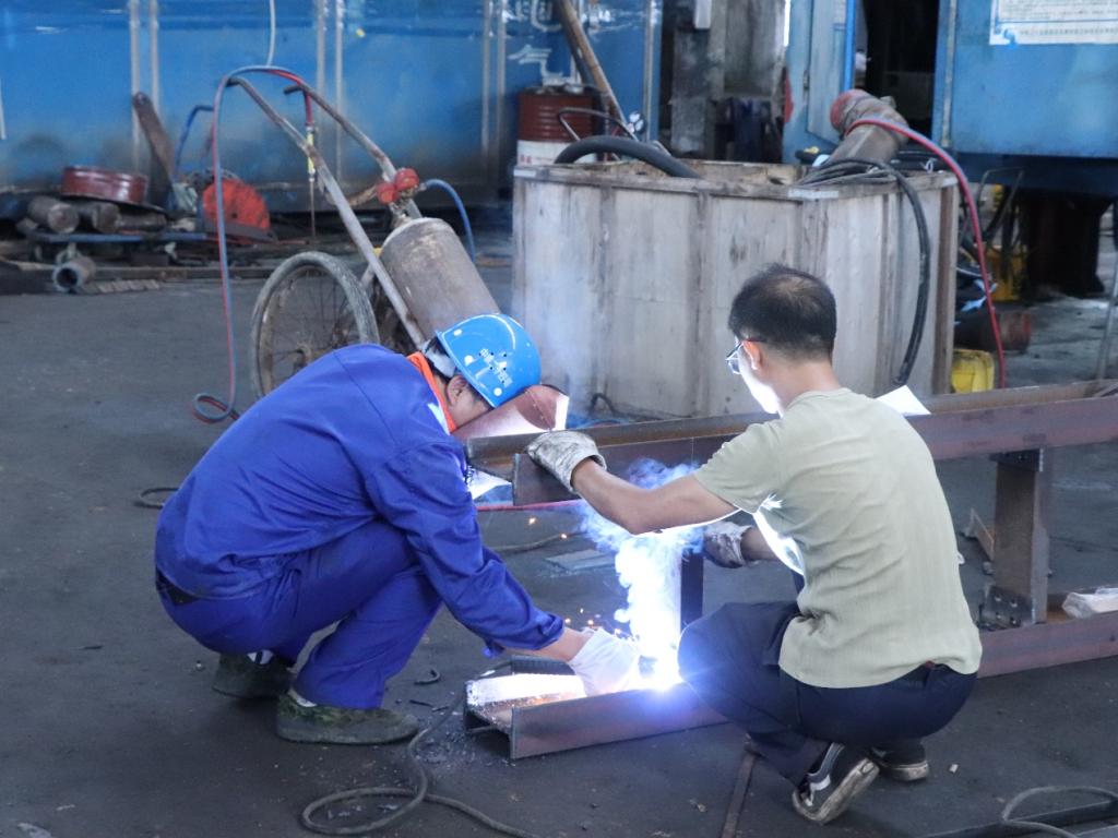 一把尺子,一副面罩,炽热的火花间,两人的初心在燃烧。“我们两个一起工作很久了,他负责测量和划线,画好了之后我再加工。”焊接师傅一手拿着焊枪,一手拿着面罩向实践团成员们演示。为了保证部件严丝合缝,两个师傅都比较“能蹲”,日复一日地盯着待加工零件,在生产一线耕耘。
