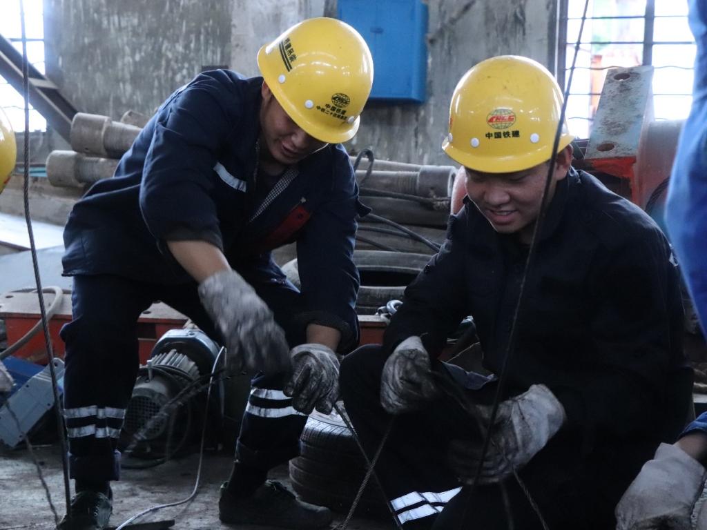 靠窗的位置,一位年长的师傅正手把手教青年职工编织吊装用绳,并悉心纠正他们的错误。尽管手套上满是黑色的印记,两位青年职工的脸上仍带着真挚的笑容,互相交流编织技巧,确保交叉方向正确。