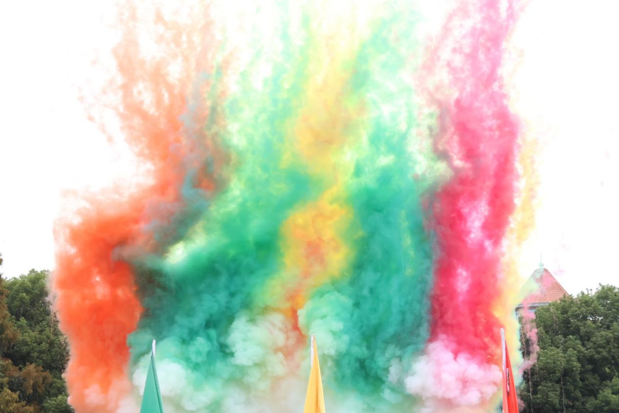 礼炮齐响,同学们欢呼雀跃,共同迎接一年一度的盛会。彩烟袅袅,展现着华交人的青春活力;五彩斑斓,象征着学子们的青春年华。