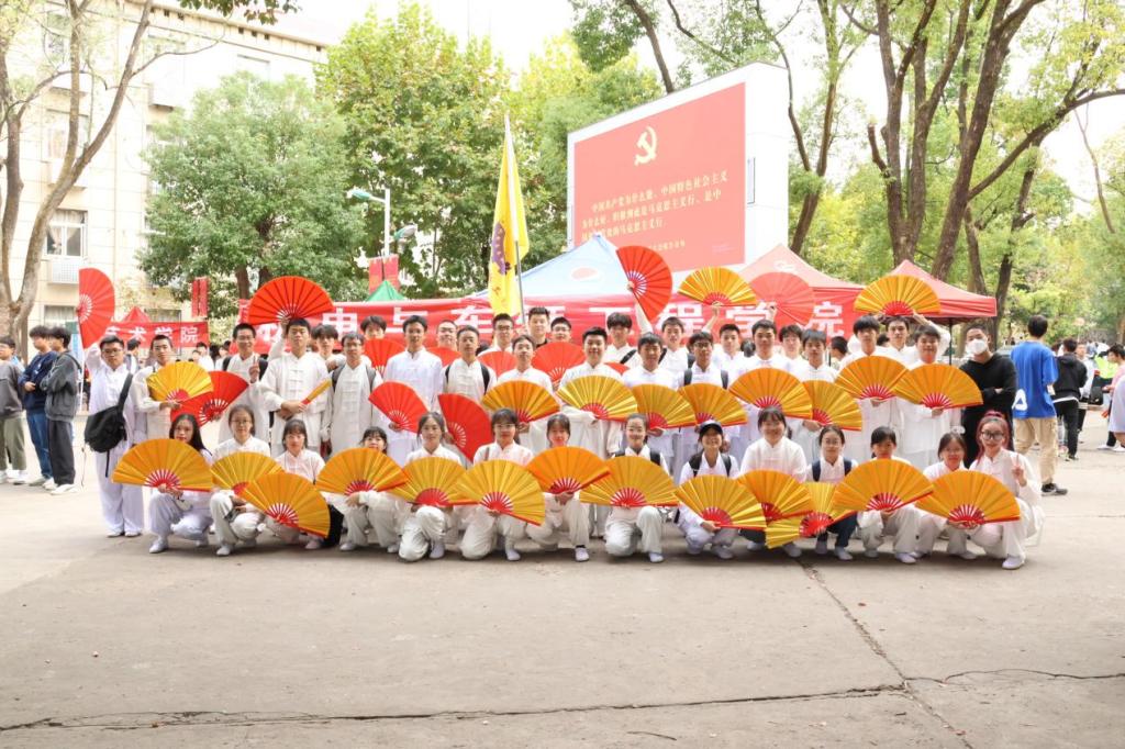 绿茵球场上,机电太极队队员们身着太极服,手持太极扇,身如桅杆脚如船,伸缩如鞭势如澜,打出了“怀抱乾坤风云转,吞吐开合应万变”的风骨。一招一式、一张一弛,他们将太极的急缓相见、行云流水展示的淋漓尽致。