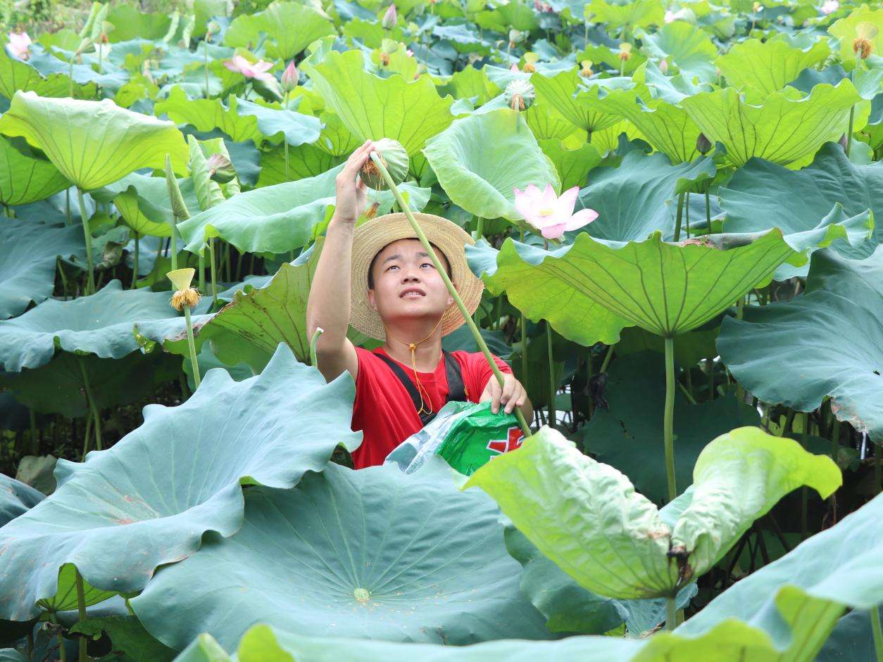 “接天莲叶无穷碧,映日荷花别样红”,实践队首先来到了莲花田中帮助村民采摘莲子,莲叶莲花在烈阳下格外耀眼,绿色莲叶与粉红花朵在似火骄阳下展现着妖娆姿态。