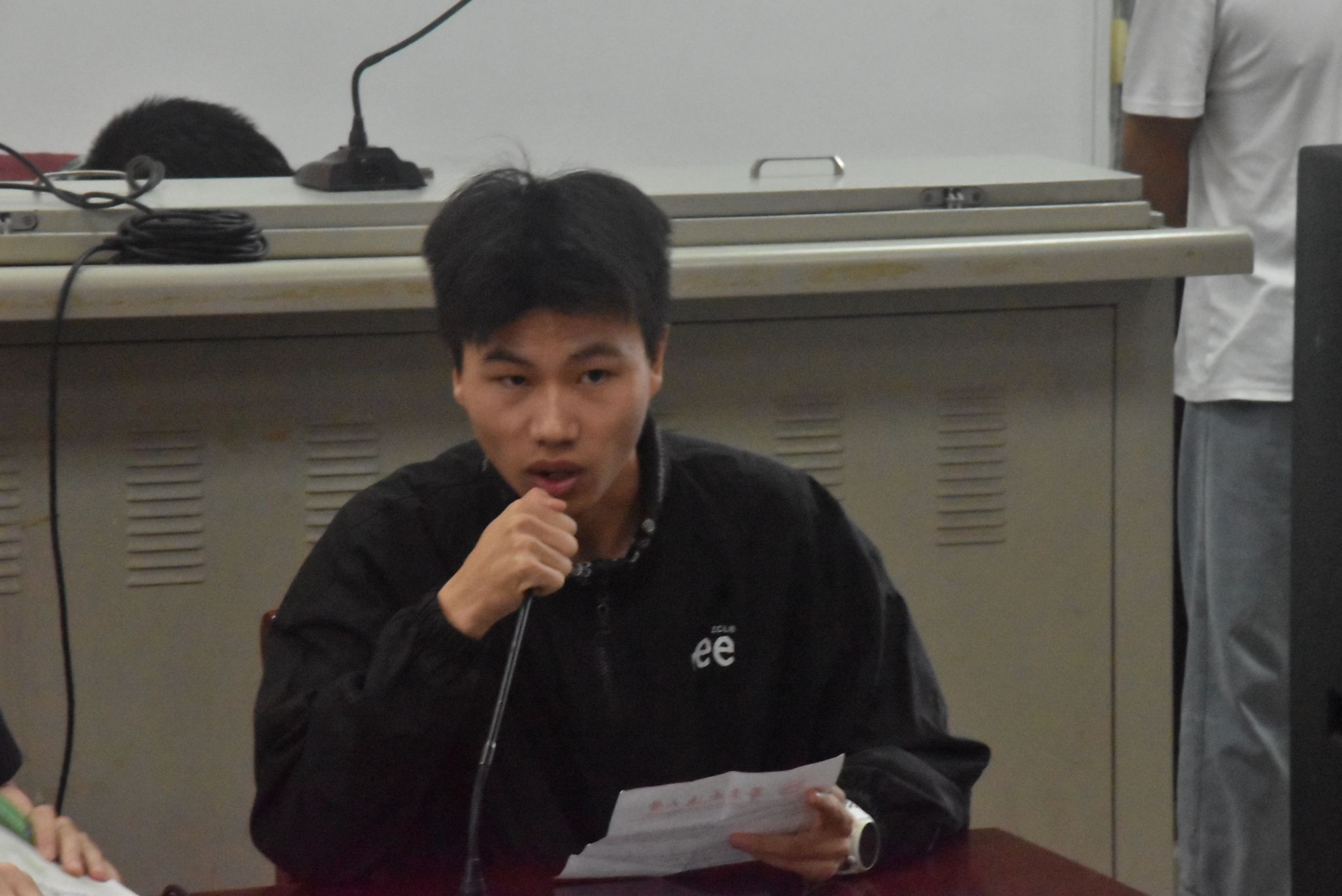 掌声过后,运动员代表丁宇上台,他以自身经验为例,用铿锵有力的发言对大家做出动员。他充满信心的话语中流露出他对同学们的信任与鼓励,激发着同学们追求卓越的热情。