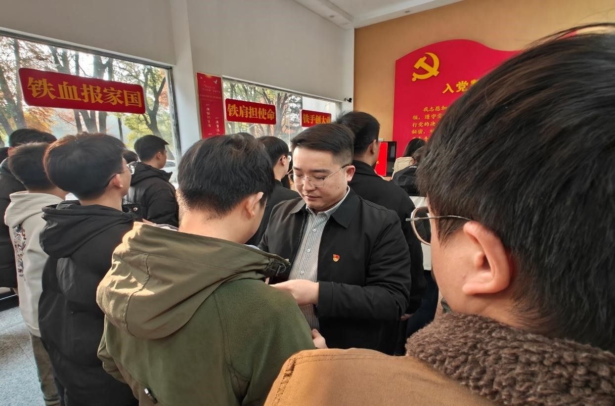 党委副书记陈铭老师和党委组织员罗青老师为预备党员们逐一佩戴党徽。党徽在阳光下熠熠生辉,宛如一盏明灯,照亮了他们前行的方向;更似一份无声的嘱托,提醒着他们时刻以党员的标准严格要求自己,践行党的使命。