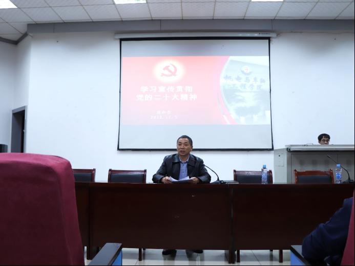 会上,陈和金同志强调学习宣传贯彻党的二十大精神是当前和今后一个时期我们的首要政治任务,并从深刻领会党的二十大的主题、过去5年的工作和新时代10年的伟大变革、开辟马克思主义中国化时代化新境界、新时代新征程中国共产党的使命任务、中国式现代化的中国特色和本质要求,深刻领会社会主义经济建设、政治建设、文化建设、社会建设、生态文明建设、法治建设、外交工作、坚持党的全面领导和全面从严治党等重大部署,对党的二十大精神进行深入阐释。