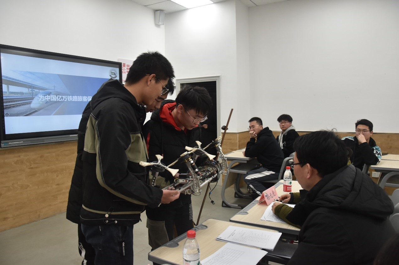 (图为团队成员向评委展示线路机器人)