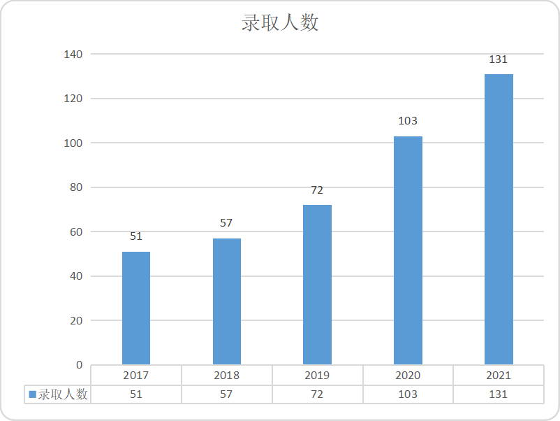 PA视讯平台研究生录取率逐年提高,形势喜人,录取率在公司名列前茅。PA视讯平台2021年毕业生总人数为506人,考研上线人数140人,上线率为27.67%,考研录取人数高达131人,考研率为25.88%,再创历史新高。从2017年录取人数51人、考研录取率10.65%到2021年录取人数131人、考研录取率25.88%,公司的考研录取人数翻了一番,员工录取院校也有了质的提升,2021年考研同学中有71人录取国家“双一流”高校,占考研录取人数的54.19%,以下是近五年的录取人数和考研率: