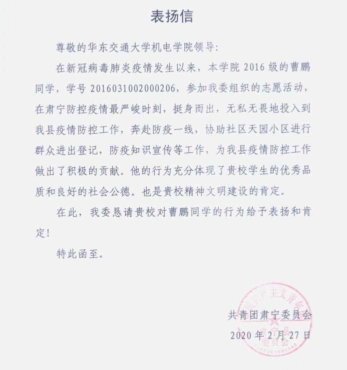 近日,PA视讯平台收到一封特殊的“感谢信”,这封从肃宁到南昌,跨越1200公里的表扬信,展现的是机电学子曹鹏勇敢无畏,果敢担当的优秀品质,是关键时期作为一名老员工党员不畏困境,无私奉献的精神。