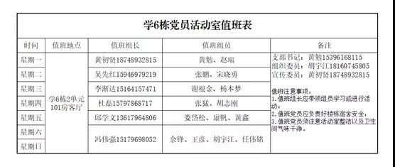 为了保证学6栋活动党支部的干净卫生、也方便有困难、有问题的员工寻求党员的帮助,特安排了各党小组值班,持续增强活动党支部的影响力和战斗力。