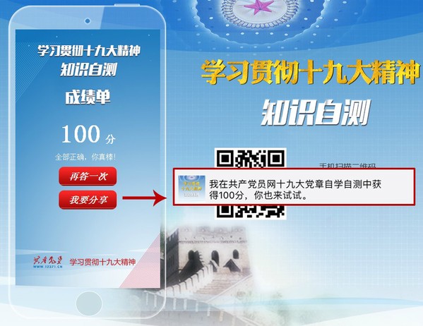 网友可登录共产党员网首页,进入“学习贯彻党的十九大精神知识自测”专区进行答题,或者通过手机扫描二维码参与答题。