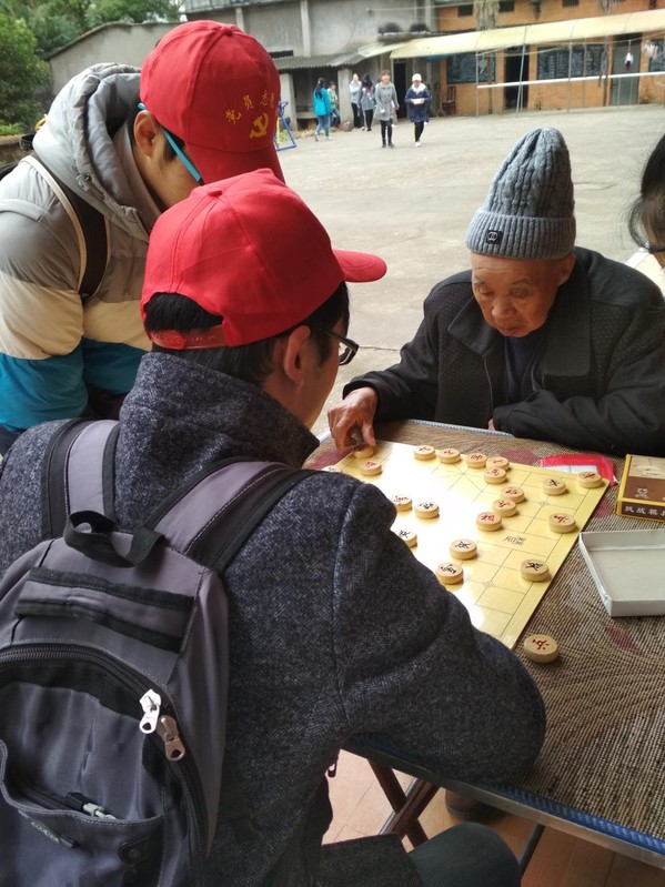 党员们一踏进敬老院,看到一位爷爷坐在房门口,为了给爷爷解解闷,党员同志们主动提出与爷爷下象棋,爷爷欣然答应,在下棋过程中和爷爷聊聊日常生活。由于天气较冷,其他老人都待在屋里,几位能听懂方言的党员同志们进房间与老人们交谈,聊聊家常。起初老人们显得有些拘谨,寒暄几句过后,党员同志们打开了老人们的心扉,熟络地交流了起来。党员们还分工合作为老人们打扫院子,尽全力为老人们提供一个舒适的生活环境。