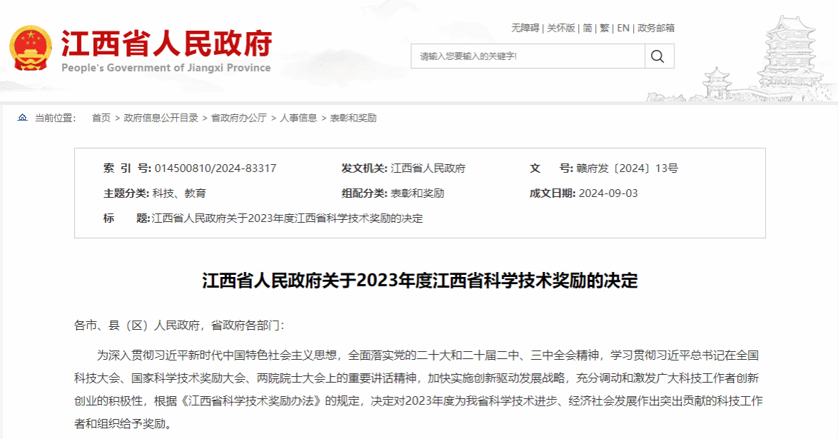9月3日,《江西省人民政府关于2023年度江西省科技技术奖励的决定》(赣府发〔2024〕13号)发布,公布了2023年度江西省科学技术奖的获奖名单,公司丁孺琦教授、刘燕德教授主持的项目分别获得科技进步奖二等奖。